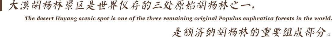 大漠胡杨林景区由游客集散服务功能区和胡杨林生态景观游览区组成。